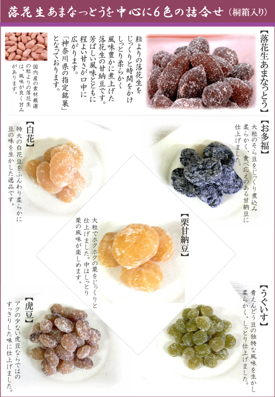原材料名 【落花生甘納豆】落花生(国内産)、砂糖、還元水飴【栗】栗、砂糖、還元水飴/クチナシ黄色素【お多福】砂糖、蚕豆【白花】砂糖、白花豆、還元水飴【うぐいす】砂糖、えんどう豆、還元水飴【大正金時】砂糖、大正金時、還元水飴