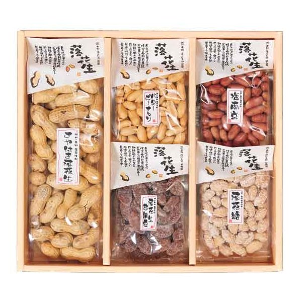 人気の高い塩南京、バターピーナッツ、さや付落花生、落花糖、落花生甘納豆の詰合せです。