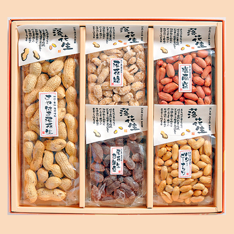 | 原材料名 | 【さや付落花生】落花生(国内産)【塩南京】落花生(国内産)、食塩【バターピーナッツ】落花生(国内産)、植物油、マーガリン、食塩/香料、(一部に落花生・乳成分・大豆を含む) 【落花糖】落花生(国内産)、砂糖、植物油【落花生甘納豆】落花生(国内産)、砂糖、還元水飴 |